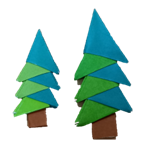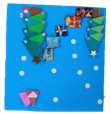 ちいさな折り紙を使って、ツリー、プレゼントの箱、サンタさんの顔などのパーツを作り、それを組み合わせたり、台紙に張ったりしていきます。最後にキラキラビーズシールなどで、飾りつけをして完成です。